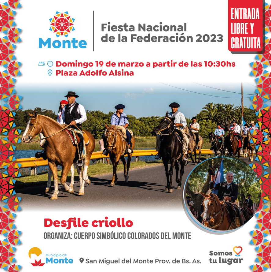 - Desde las 10:30hs: Desfile criollo en la Plaza Adolfo Alsina. Organiza Cuerpo Simbólico Colorados del Monte.