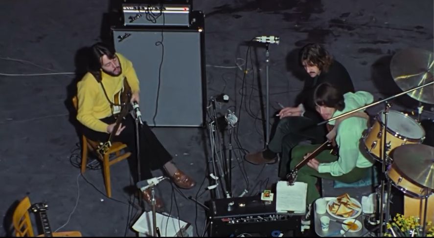 “Sintiendo la presión de la cercanía del cierre del tiempo para componer nuevas melodías, lo que emerge se transformará en el próximo single”, es el austero sobreimpreso que coloca Peter Jackson en el preciso instante de las imágenes de Paul con una guitarra sentado en una silla inventando el “hit” que luego será “Get Back”, ante la mirada de George Harrison y Ringo Starr