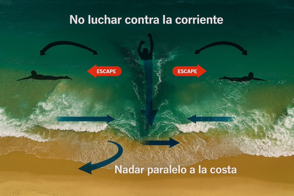 Según detalla, esta corriente se genera cuando el agua acumulada en la orilla busca volver al mar a través de un canal. Es lo que muchos bañistas interpretan como “un hueco sin olas”, pero que en realidad actúa como una cinta transportadora natural que empuja hacia afuera.