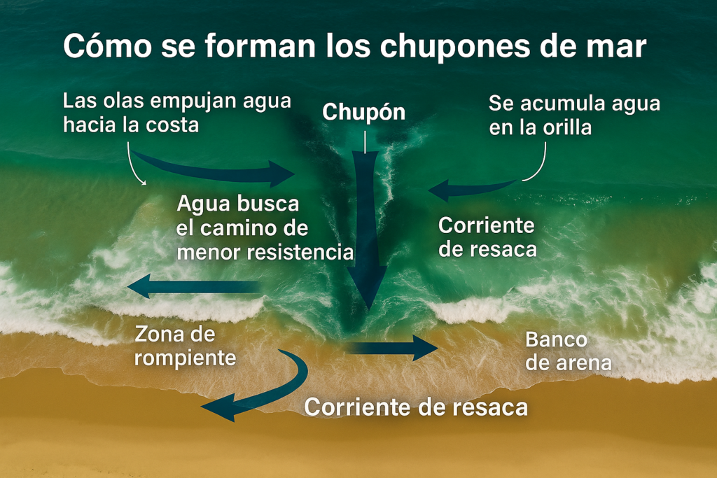 La mecánica es simple pero letal: cada ola que rompe empuja agua hacia la costa. Ese volumen queda acumulado por unos segundos, generando un desnivel casi imperceptible. Cuando el mar necesita liberar esa agua, busca el punto más profundo del fondo —un canal, un pozo o un corte entre bancos de arena— y se acelera violentamente por ese hueco, formando el “cuello” del chupón.