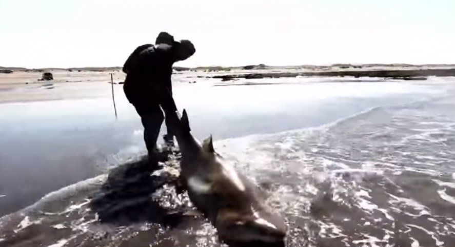 En el video se ve como los pescadores devolvieron el ejemplar al mar debido a que la reglamentación actual establece la devolución obligatoria de todas las especies de tiburón, salvo el gatuzo.