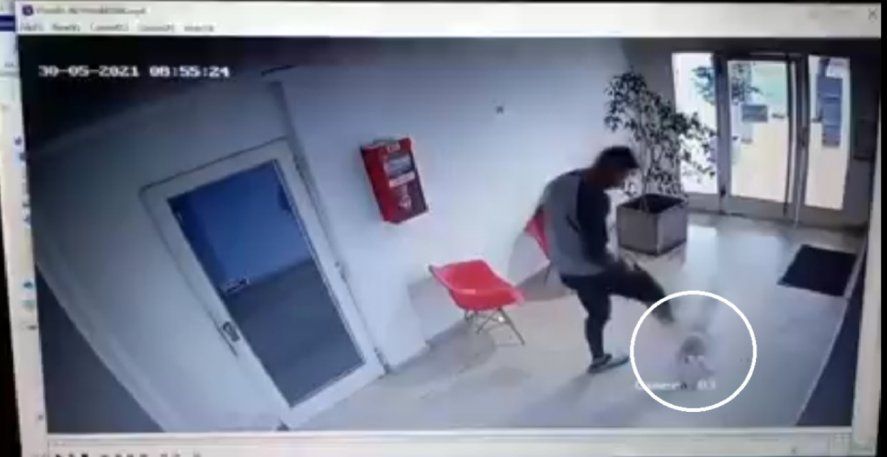 Según se puede ver en la filmación, el agresor golpea reiteradas veces y con violencia al pequeño animal hasta sacarlo a la vereda: