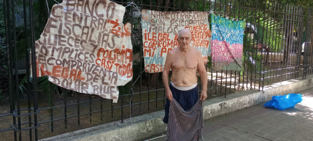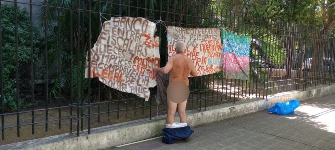 Un vecino de Arturo Seguí llamado Juan Antonio Vázquez se presentó frente a los Juzgados Penales de La Plata, en 8 y 57, con una ”protesta desnuda” contra ”el narcotráfico, la compra/venta ilegal de dólares Blue”.