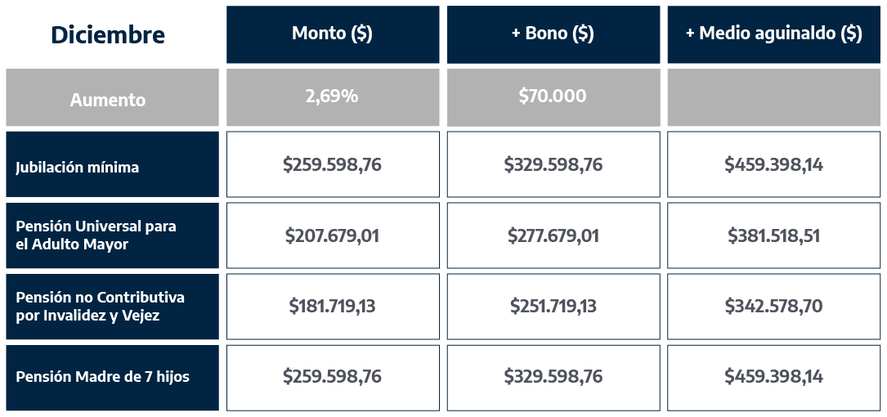 En diciembre, las jubilaciones, pensiones y asignaciones reciben un aumento de 2,69%. De esta manera, quienes cobran la jubilación mínima, junto con el bono de 70 mil pesos, recibirán $329.598,76.