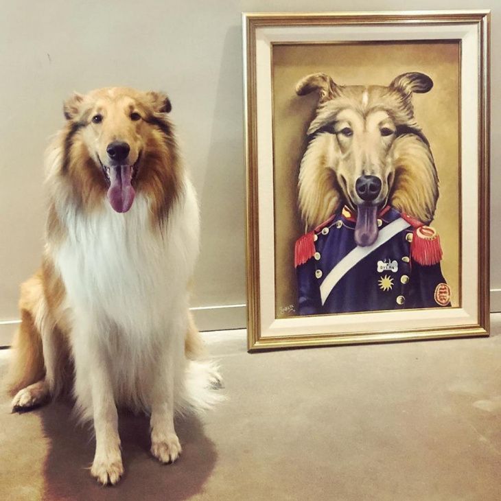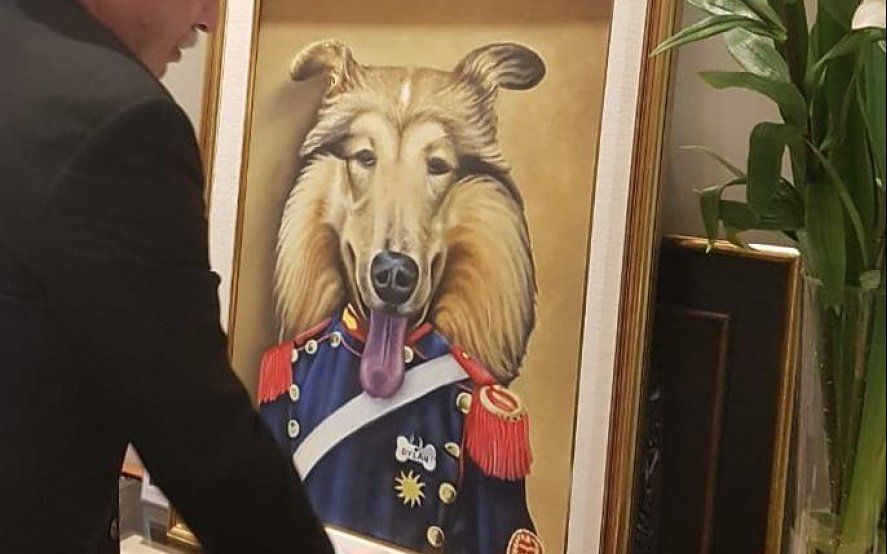En el cuadro que Alberto mandó a enmarcar y que ahora se encuentra colgado en una de las paredes de su despacho en Olivos junto con otros objetos que son los más valorados por el actual presidente, se lo ve a Dylan posando serenamente con la lengua hacia fuera, las orejas levemente caídas hacia los costados y, lo que más llama la atención es que, debajo de su cara, está vestido como un granadero.