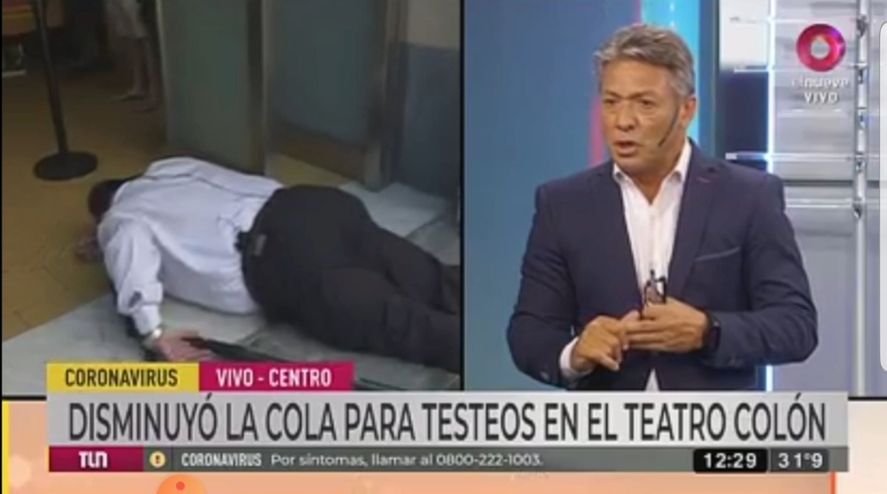 Desde la puerta del Teatro Colón, el notero estaba realizando una salida en vivo desde el móvil relatando que, a pesar del gran número de personas que se estaban practicando el test de Covid, esa cantidad era menor a la que pudo observarse la semana anterior.
