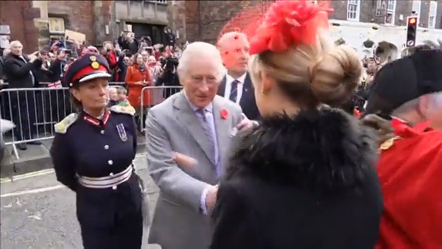 El preciso instante en que le son arrojados los huevos al Rey Carlos III del Reino Unido. Por esta situación hay un detenido