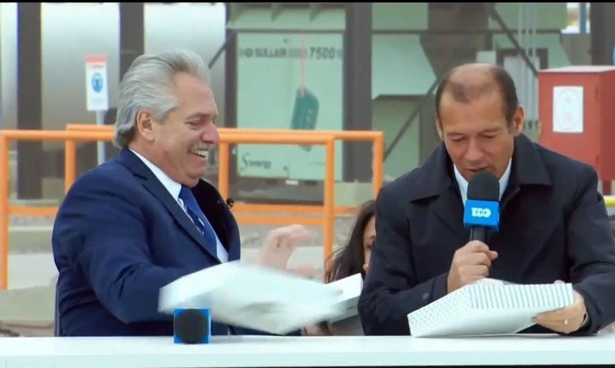 Inmerso en una especie de torbellino que azotaba “y pegaba fuerte” sobre los dirigentes y asistentes al evento, el gobernador de la provincia patagónica, Omar Gutiérrez, le quiso hacer entrega de unos “presentes” a Alberto Fernández, quien los recibió agradecido, mientras ambos trataban de que no se volaran de la mesa a la que estaban sentados frente al público, en medio del remolino.