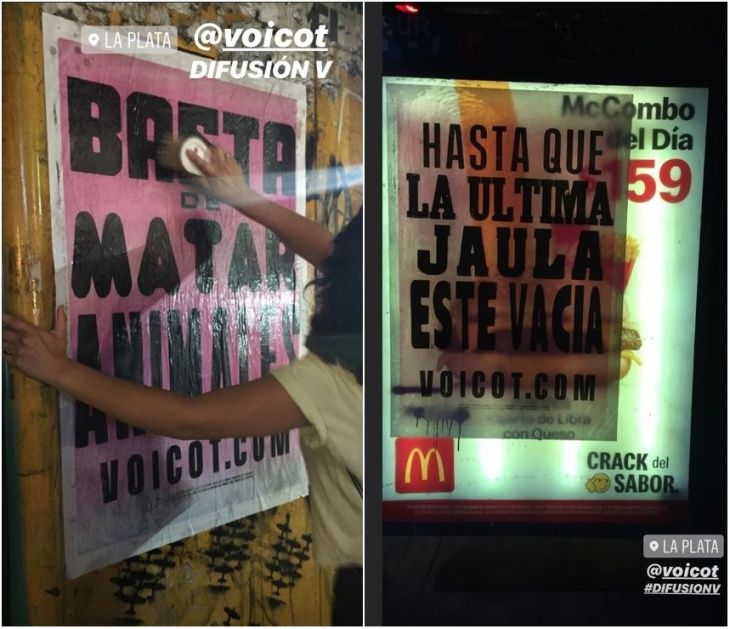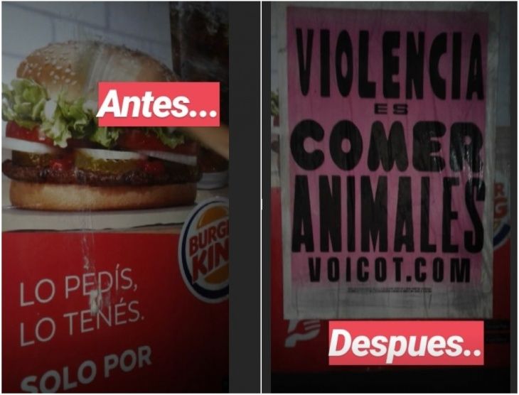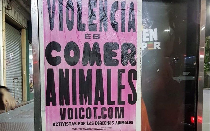 Sobre carteles de afamadas cadenas de hamburguesas que promocionan sus combos en las calles de La Plata, un grupo de activistas veganos pegó anoche sus propios afiches con un mensaje contundente: “Violencia es comer animales”.