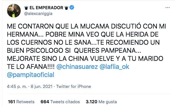 “Me contaron que la mucama discutió con mi hermana…pobre mina veo que la herida de los cuernos no le sana…te recomiendo un buen psicólogo si querés pampeana…mejorate sino la China vuelve y atu marido te lo afana”, escribió Alex en sus cuenta de Twitter recordando no sólo el apodo que le pusieron a Pampita algunas de sus compañeras en el comienzo de su carrera sino también el episodio con Vicuña y la China Suarez.