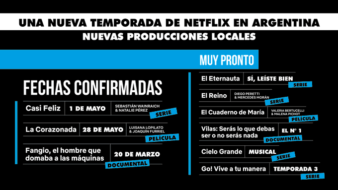 La cuenta de Twitter @CheNetflix publicó: “PAREN TODO. Tengo un gran anuncio: se vienen todas estas producciones argentinas originales de Netflix y no puedo más de la manija. Voy a desmenuzar una por una con toda la info que tengo porque ustedes se lo merecen”.
