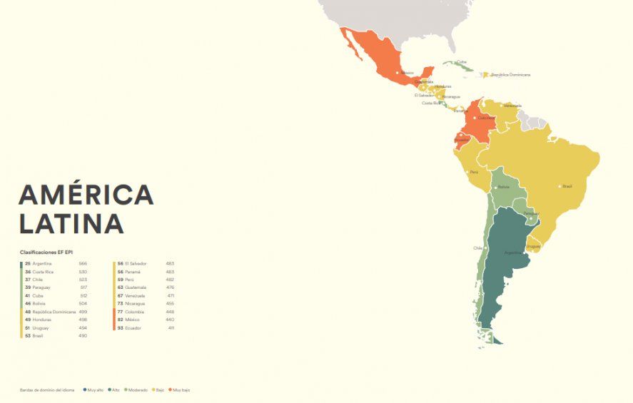En Latinoamérica, el mejor posicionado de los 19 analizados fue Argentina, que comparte el grupo de “Nivel Alto de Inglés” con países como Francia, Croacia, Suecia y Grecia. Recién en el “Nivel Medio” aparecen Costa Rica, Chile, Paraguay y Bolivia. Ecuador, Colombia y México están entre los peores con el grupo “Nivel Muy Bajo”.