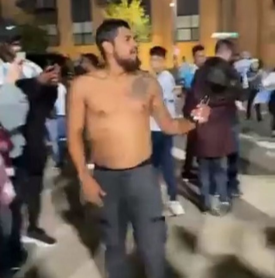 Un argentino reconoce al intruso número 2 a la salida del estadio (el primero de ropa roja fue tacleado violentamente antes de alcanzar a Messi, y el tercero, de remera de Argentina, tampoco llegó a su objetivo). Al verlo le pide poder enfocar la firma de Lionel Messi, o al menos lo que la seguridad llegó a permitir hasta derribar al “espontáneo“.