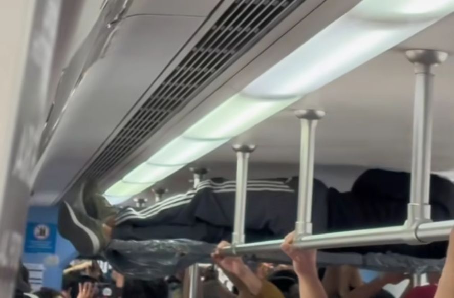 Un muchacho sorprendió a todos al viajar acostado sobre una madera, adaptando su improvisada “cama” con un almohadón para mayor comodidad, encima del caño que sirve para asirse ante los movimientos de la formación cuando viaja gente de pie.