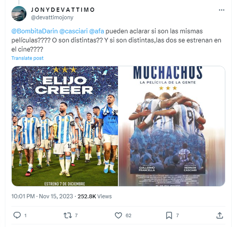 Sin embargo, aunque la confusión apareció porque es el mismo eje temático y se estrena el mismo día, Hernán Casciari se expresó nuevamente: “Vayan al cine a ver el documental que quieran. O vayan a ver los dos si están cebados. O no vayan a ver ninguno y esperen a que estén disponibles en plataformas. Lo importante es que el 7 de diciembre se estrenan dos películas y que seguro se van a llenar de gente las dos, y que vamos a festejar ser campeones del mundo y tener actores de la talla de Darín y Francella“.