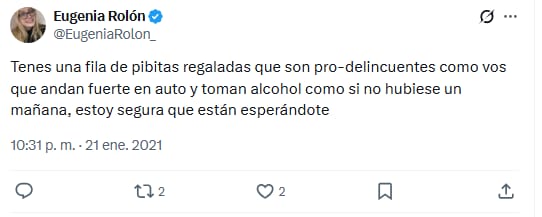 Más allá del hecho en sí, la situación generó una fuerte controversia por los antecedentes discursivos de la propia Rolón. En redes sociales, comenzaron a reflotarse antiguos posteos de la influencer en los que cuestionaba con dureza conductas idénticas a las que ahora se le atribuyen. En uno de ellos, escribió: “Tenés una fila de pibitas regaladas que son pro-delincuentes como vos que andan fuerte en auto y toman alcohol como si no hubiese un mañana, estoy segura que están esperándote”.