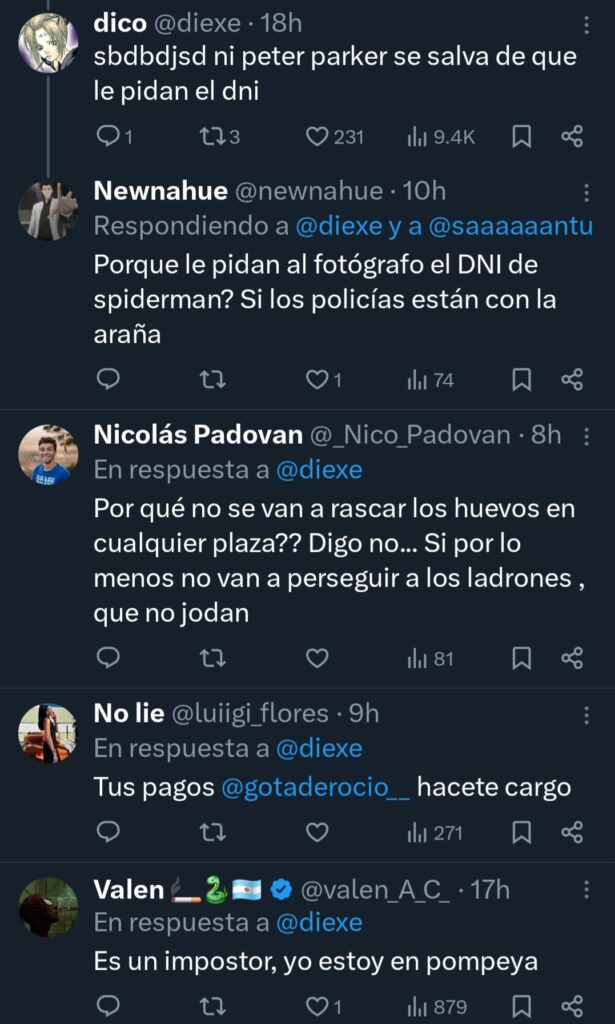 En cuestión de horas, la foto fue compartida miles de veces en redes sociales y generó una catarata de comentarios desopilantes, mezcla de humor, ironía y crítica social. “Ni Peter Parker se salva de la caza de brujas libertaria”, escribió un usuario, aludiendo con sarcasmo al clima represivo que todos señalan en la actual gestión de gobierno. Otro remató: “Le pidieron el registro de lanzar telarañas”, mientras un tercero se preguntaba “¿tenía permiso para trepar edificios o ya lo tildaron de usurpador?”