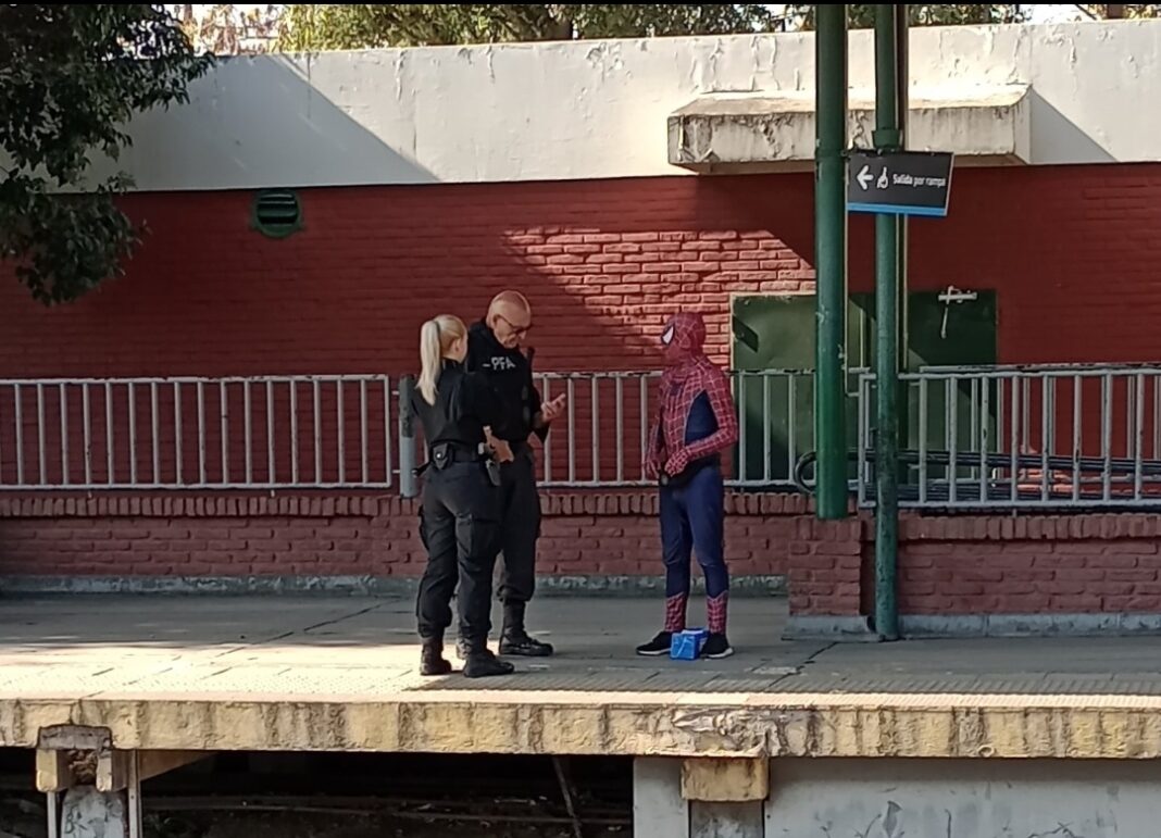 La imagen lo dice todo: el superhéroe de los cómics frente a dos oficiales que, sin soltura ni guiños a la fantasía, le exigen documentos. Spiderman, obediente y algo resignado, mantiene la postura erguida mientras escucha atentamente. El cartel sobre su cabeza, que indica “Salida por rampa”, no hizo más que añadirle poesía a una postal urbana tan bizarra como del Conurbano.