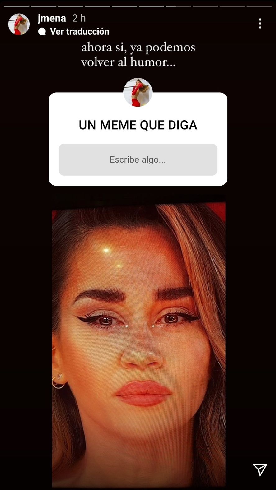 Pero, luego de lo sucedido en “La Academia”, Jimena decidió ponerle humor a la situación y le hizo una propuesta a sus seguidores a través de su cuenta de Instagram: subió una foto a sus stories en la que se ve su rostro angustiado y escribió: “Un meme que diga”.