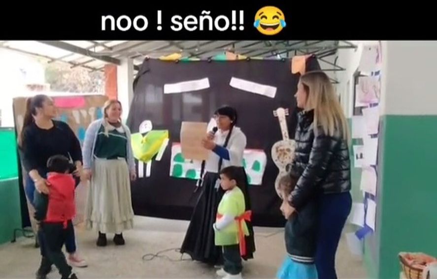 Miles de cuentas de Twitter y Tiktok comenzaron a replicar un video hasta hacerlo viral. Se trata claramente de una fiesta escolar en donde los niños están con ropas gauchescas al estilo tradicionalista. La maestra, que sostiene el micrófono, se anima a leer una rima humorística que parece extraída más de un sketch de Yayo, que apta para chicos en edad escolar.
