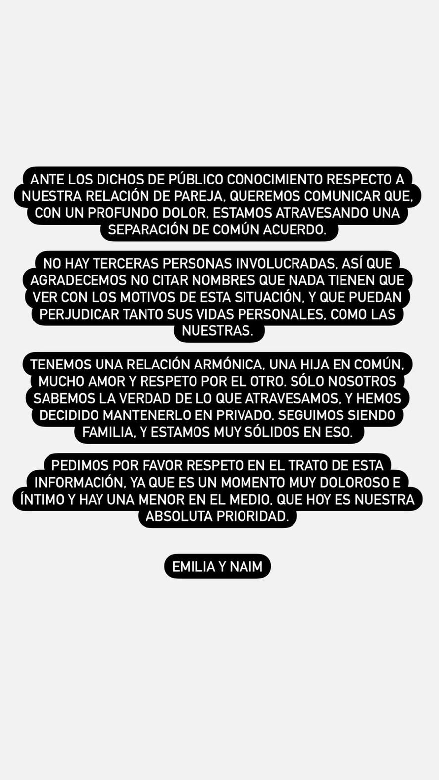 Horas después, ambos actores compartieron un comunicado a través de su representante: “Queremos comunicar que, con un profundo dolor, estamos atravesando una separación de común acuerdo”, intentando despejar rumores: “No hay terceras personas involucradas”. Finalmente sentenciaron: “Tenemos una relación armónica (…) Seguimos siendo familia. Y estamos muy sólidos en eso”.