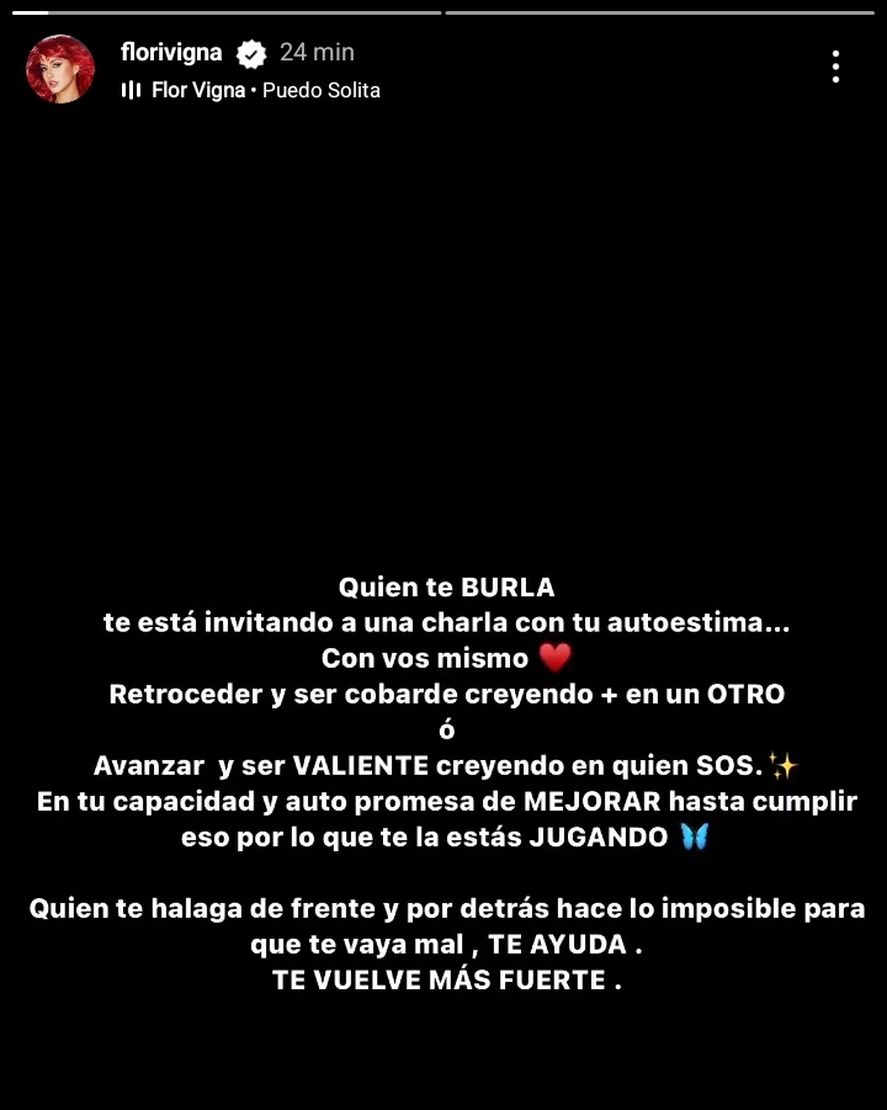 Además, en sus historias la también actriz y bailarina publicó otro mensaje donde expresó: “Quien te burla te está invitando a una charla con tu autoestima. Con vos mismo. Retroceder y ser cobarde creyendo más en un otro, o avanzar y ser valiente creyendo quien sos, en tu capacidad y autopromesa de mejorar hasta cumplir eso por lo que te la estás jugando”.