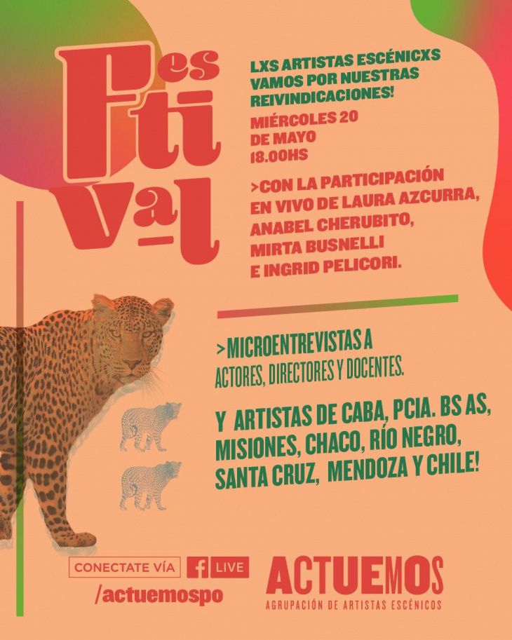 Artistas de todo el país transmitirán, este miércoles a las 18hs, en vivo vía Facebook un gran festival. Habrá piezas teatrales, circenses, de danza, performances, cine y música y entrevistas en vivo a Laura Azcurra, Anabel Cherubito y lecturas de piezas literarias por Mirta Busnelli e Ingrid Pelicori, entre otrxs. También microentrevistas a docentes y directores de teatro y danza.