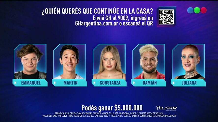 Uno de los integrantes de la placa se despedirá este domingo de la casa a través del voto telefónico del público. Aunque aún falta conocer la decisión de Federico, los televidentes ya puede votar a los actuales nominados. Cabe recordar que el voto es positivo, es decir, se debe votar a quién uno desea que se quede en la casa.