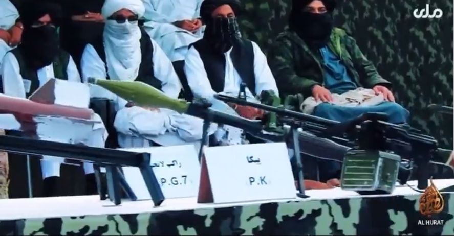 Las imágenes del desfile de armas muestran a un grupo de combatientes marchando con la bandera del Emirato Islámico, adelante de una fila de varios vehículos que remolcaban armas y bombas de fabricación estadounidense.