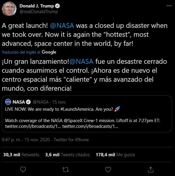 Trump aprovechó la oportunidad para generar polémica y escribió: “¡Un gran lanzamiento! La NASA era casi un desastre cuando asumimos. Ahora es otra vez ‘la más linda’, más avanzada, ¡Centro espacial del mundo por mucho!”