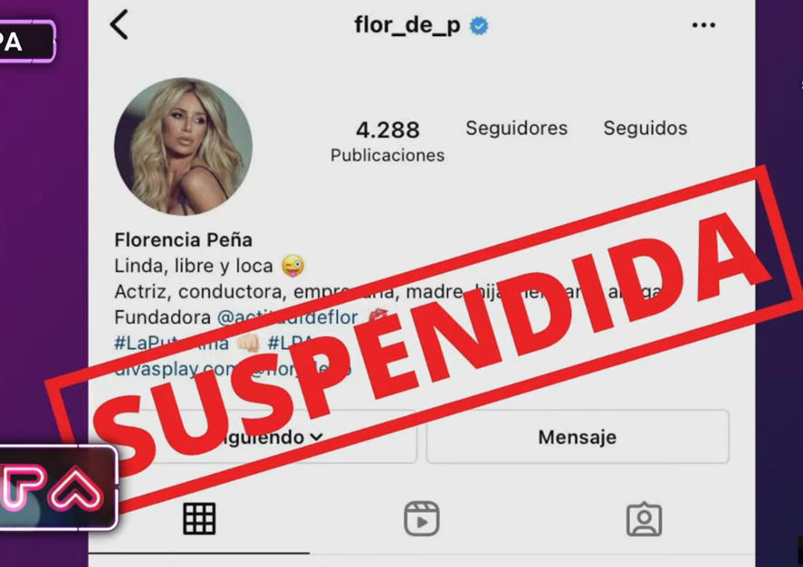 Instagram suspendió la cuenta de Florencia Peña y la conductora de “LPA” hizo un extenso descargo en su programa, “Solamente a una puta ama le pueden suspender el Instagram con 6 palos de seguidores. Chicos, no es joda. Me suspendieron el Instagram. ¡Suspendida! No me aparecen ni… Lo único que me aparece es ‘linda, libre y loca’. Y a la mierda con el ‘libre y loca’”, comenzó relatando Flor en el comienzo de su programa.