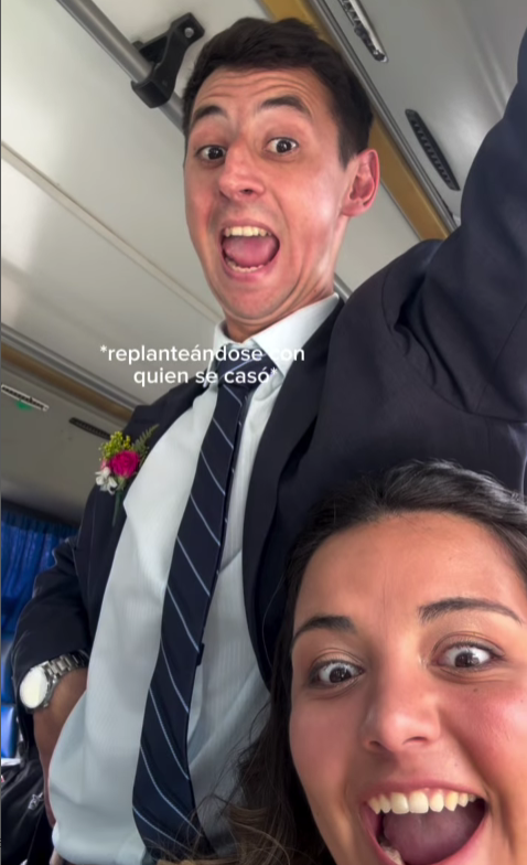 La feliz pareja es oriunda de la ciudad de Santo Tomé, Santa Fé, registró a través de las redes todo el viaje en colectivo hasta el lugar de su boda. Todo fue risas y buenos deseos.