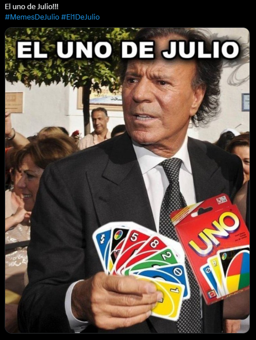 Este lunes comenzó julio, el séptimo mes del año, y como acostumbran los usuarios de las redes sociales aprovechan a darle la bienvenida con divertidos memes. Y es que desde hace algunos años, las imágenes del cantante Julio Iglesias son moneda corriente en publicaciones, stickers de WhatsApp, gifs y más.