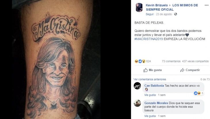 “Quiero demostrar que los dos bandos podemos estar juntos y llevar el país adelante #MACRISTINA2019 EMPIEZA LA REVOLUCIÓN!”, escribió el joven en un grupo de Facebook, aunque no aclaró si el simpático dibujo pertenecía a su cuerpo.