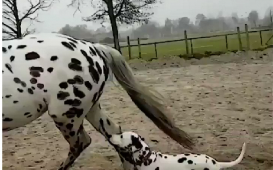 En el video se puede ver a un dalmata corriendo desesperado a una yegua con exáctamente las mismas manchas características de su raza. El posteo de Twitter obtuvo mucha repercusión en las redes y rapidamente se volvió viral.