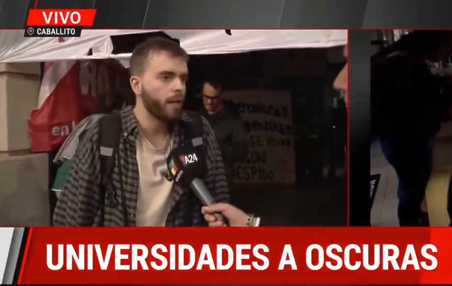 A días de la marcha federal universitaria en contra de los recortes a la educación, un móvil de A24 se acercó a la UBA, que permanece con los pasillos oscuras y con ascensores limitados a las personas con discapacidad, para consultar la opinión de los estudiantes, pero a uno de los conductores no pareció haberle gustado una de las respuestas.