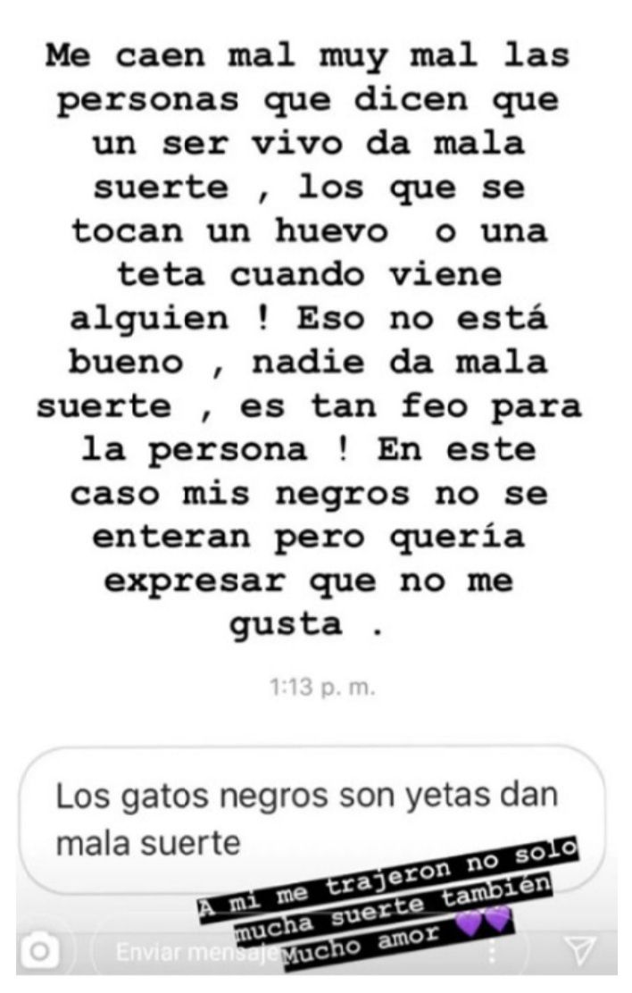 “A mí me trajo amor”, respondió ella y luego se explayó sobre el tema, “Me caen mal, muy mal, las personas que dicen que un ser vivo da mala suerte. Los que se tocan un huevo o una teta cuando viene alguien. Eso no está bueno, nadie da mala suerte y es muy feo para la persona. En este caso, mis negros no se enteran… Pero quería expresar que no me gusta”, escribió.