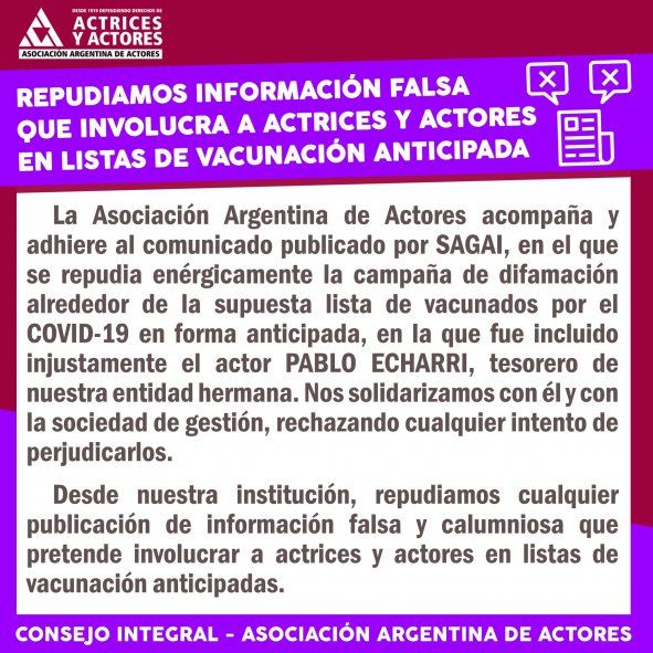 Desde la Asociación Argentina de Actores, salieron a defenderlo a través de un comunicado: “Nos solidarizamos con él y con la sociedad de gestión, rechazando cualquier intento de perjudicarlos. Desde nuestra institución, repudiamos la publicación de información falsa y calumniosa que pretende involucrar a actrices y actores en listas de vacunación anticipadas”.
