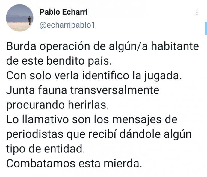 “Desde ayer a la noche vengo recibiendo mensajes sobre mi incorporación a alguna lista de vacunación preferencial. Jamás solicite una vacuna, ni para mi ni para ningún integrante de mi familia. Jamás recibí ninguna invitación para aplicarla”, aseguró Echarri en sus redes sociales.