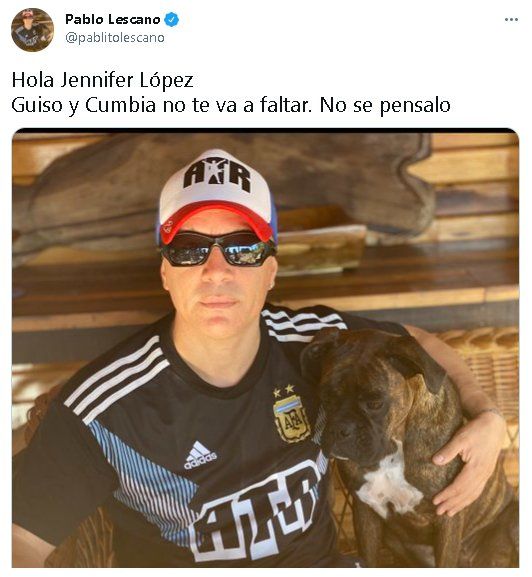 “Hola Jennifer Lopez. Guiso y Cumbia no te va a faltar. No sé, pensalo”, escribió en su cuenta de Twitter, junto a una foto en la que selo ve comiendo un guiso de lentejas y abrazando a su perro.