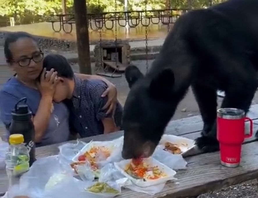 En las imágenes, captadas por otra persona que también estaba junto a ellos, se puede ver cómo el oso se acerca sigilosamente a la mesa y empieza a comerse los alimentos, mientras la familia permanece inmóvil y con evidente temor. La mujer abraza al niño y le tapa los ojos para evitar que se asuste más. El oso parece no inmutarse por la presencia humana y continúa su banquete hasta que termina con todo.