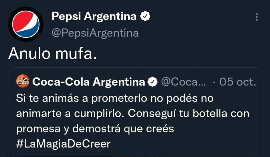 Sí bien por breves lapsos en Argentina existieron algunas publicidades comparativas entre dos marcas, la legislación en general no permite este recurso propagandístico para ser utilizado en medios de comunicación. Las redes son otra cosa y el “Community Manager de Pepsi lo sabe”. Por eso es que aprovecha cada ocasión que tiene para ser original, creativo, y dúctil a las modas y los códigos que se utilizan como tendencia en la red social que ahora pertenece a Elon Musk. En las últimas horas la cuenta oficial de la marca Pepsi citó un aviso publicitario de su principal competencia Coca Cola y repitiéndolo a través de un retweet, simplemente agregó la frase “Anulo mufa”, que desde hace un tiempo se convirtió en una frase que se puso de moda para evitar que el exitismo argentino provoque el efecto contrario e interfiera en el sueño colectivo de obtener la Copa Mundial de Qatar 2022.
