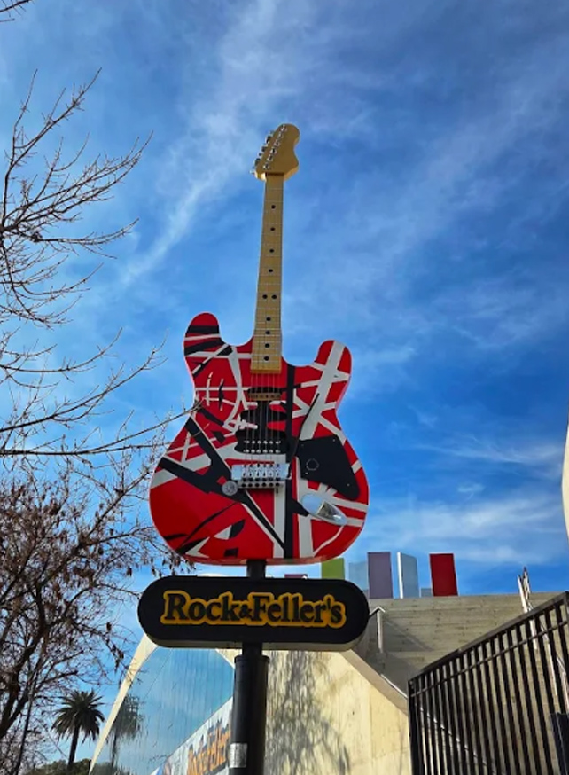 El aire huele a madera tostada, cerveza fría y carne asándose sobre leña de quebracho. En el techo, las luces reflejan el dorado de las guitarras colgadas: una Stratocaster con la firma de Satriani, una Les Paul vieja que parece tener historia, pero afuera nos recibió la guitarra Frankenstrat que el propio Eddie Van Halen construyó y eso ya era insuperable.