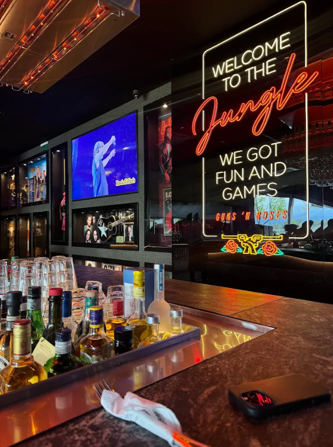 Rock & Feller’s no es un bar, ni un restaurante, ni un museo del rock. Es una mezcla rara de todos. La decoración parece una carta de amor al género: fotos de Lennon y Tina Turner, un vinilo original de Zeppelin, afiches de Nirvana, un mural de Cerati que te mira con esa calma cósmica que solo él tenía y un cartel en neón que resume todo lo que ves “Welcome to the jungle”
