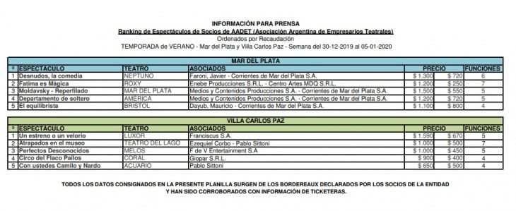 La Asociación Argentina de Empresarios Teatrales y Musicales (AADET) difundió esta tarde la taquilla de las obras teatrales que convocaron mayor cantidad de público entre el 29 de diciembre de 2019 y el 5 de enero de 2020, en las tres plazas más importantes de la temporada: Mar del Plata, Villa Carlos Paz y Buenos Aires.