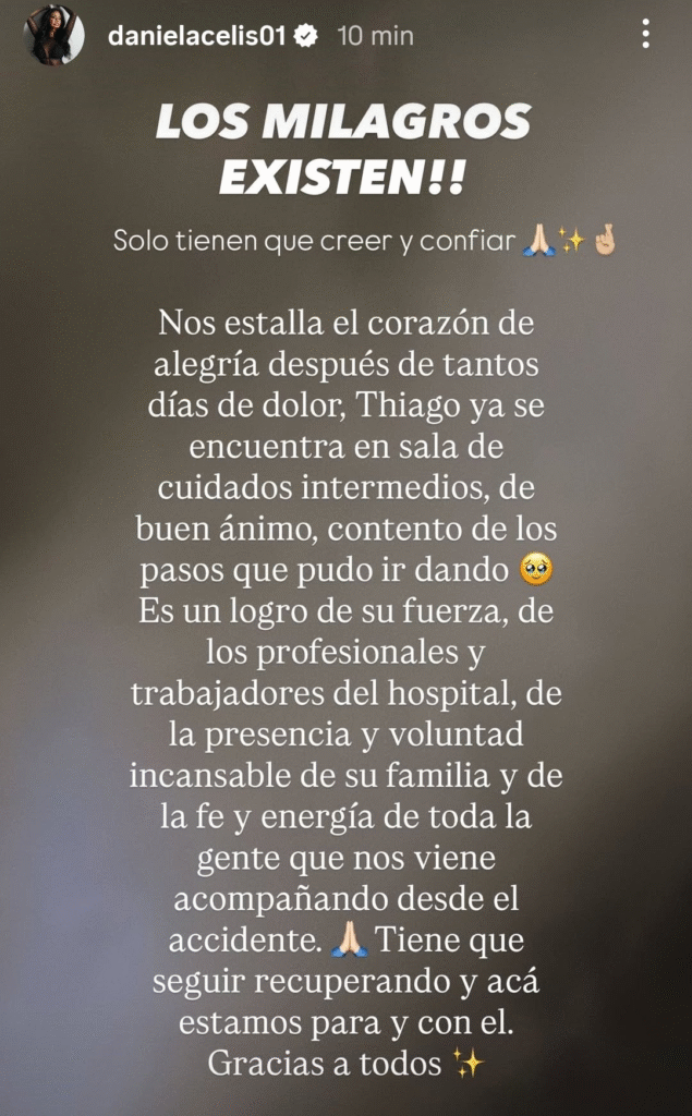 Si bien al principio, el estado de salud de Thiago era complicado, este fin de semana la joven de 29 años compartió: “Los milagros existen!!”. Y contó que el joven “ya se encuentra en sala de cuidados intermedios, de buen ánimo, contento de los pasos que pudo ir dando”.