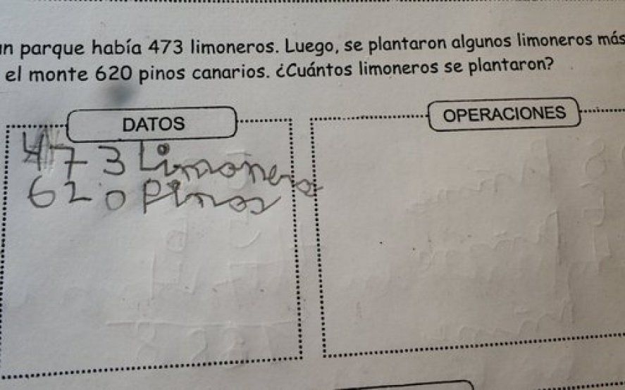 En la foto del problema matemático dice: “En un parque había 473 limoneros. Luego se plantaron algunos limoneros más. Ahora hay en el monte 620 pinos canarios. ¿Cuántos limoneros se plantaron?”.