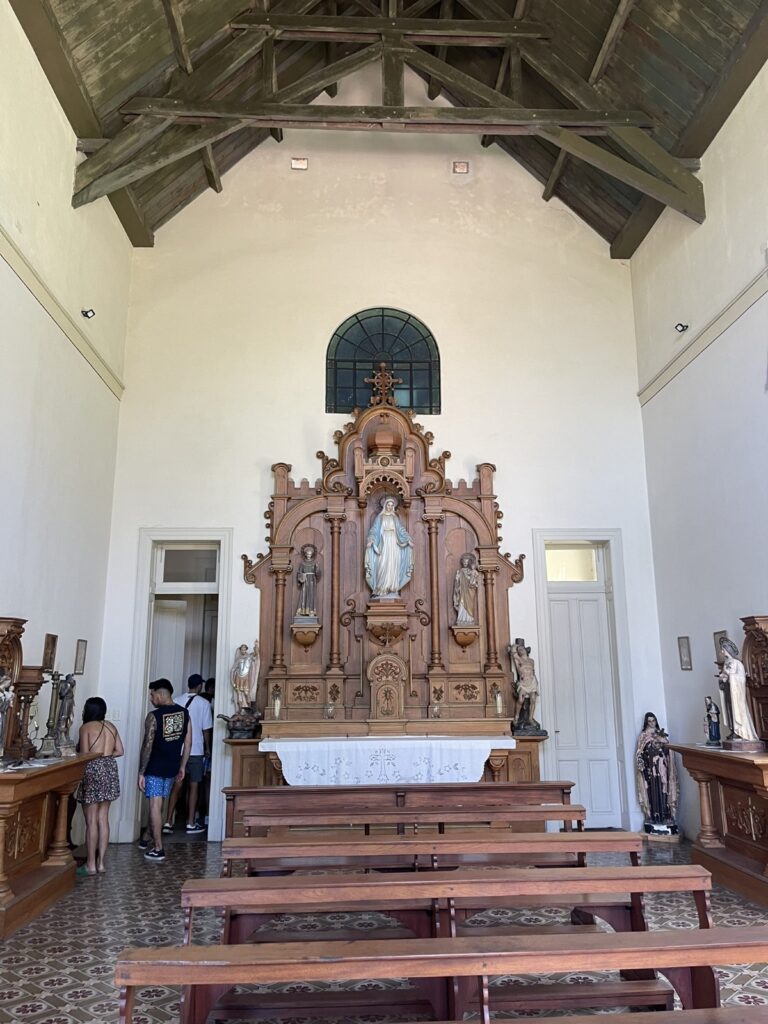 Uno de los espacios más impactantes es la capilla original, que logró sobrevivir al abandono. Su piso calcáreo, el altar de roble macizo y el techo a dos aguas crean una atmósfera silenciosa y única, que hoy se utiliza tanto para ceremonias y casamientos como para visitas contemplativas.