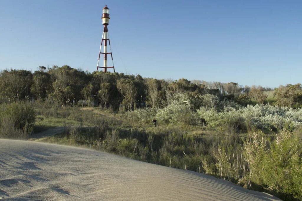 A 30 kilómetros al sur del centro de Gesell y a pocos metros del mar, el Faro Querandí se levanta en el corazón de la Reserva Natural Municipal. Su luz —que alcanza los 65 metros— es visible a 18 millas de la costa, pero su rasgo más distintivo es el paisaje: dunas inmensas, un bosque de acacias y un ecosistema único que se extiende a lo largo de 21 kilómetros.